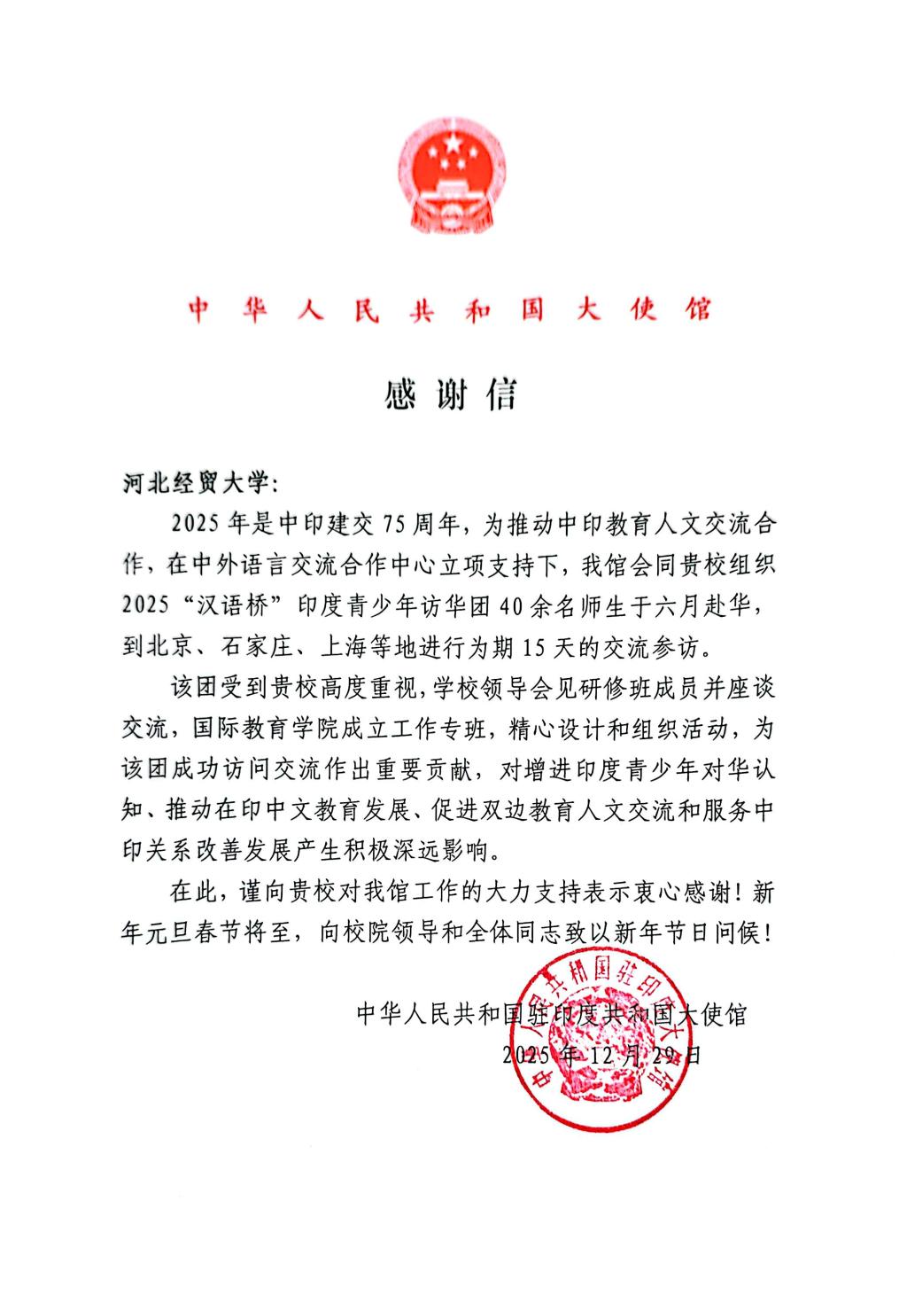 今年6月20日至7月4日,我校接待了参加“汉语桥”的“印度青少年访华团”,顺利完成为期15天的交流参访。12月29日,我校收到中国驻印度大使馆的感谢信,信中对我校为访华团活动顺利开展所作的贡献给予高度评价与诚挚谢意。