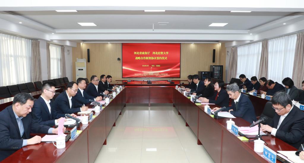 2 月 2 日下午,我校与河北省商务厅战略合作框架协议签约仪式在第五会议室举行。校党委书记李晓华,省商务厅党组书记、厅长刘毅出席并讲话,校长高波,校党委常委、副校长王重润,省商务厅党组成员、副厅长张记方出席,签约仪式由副校长杜红梅主持。