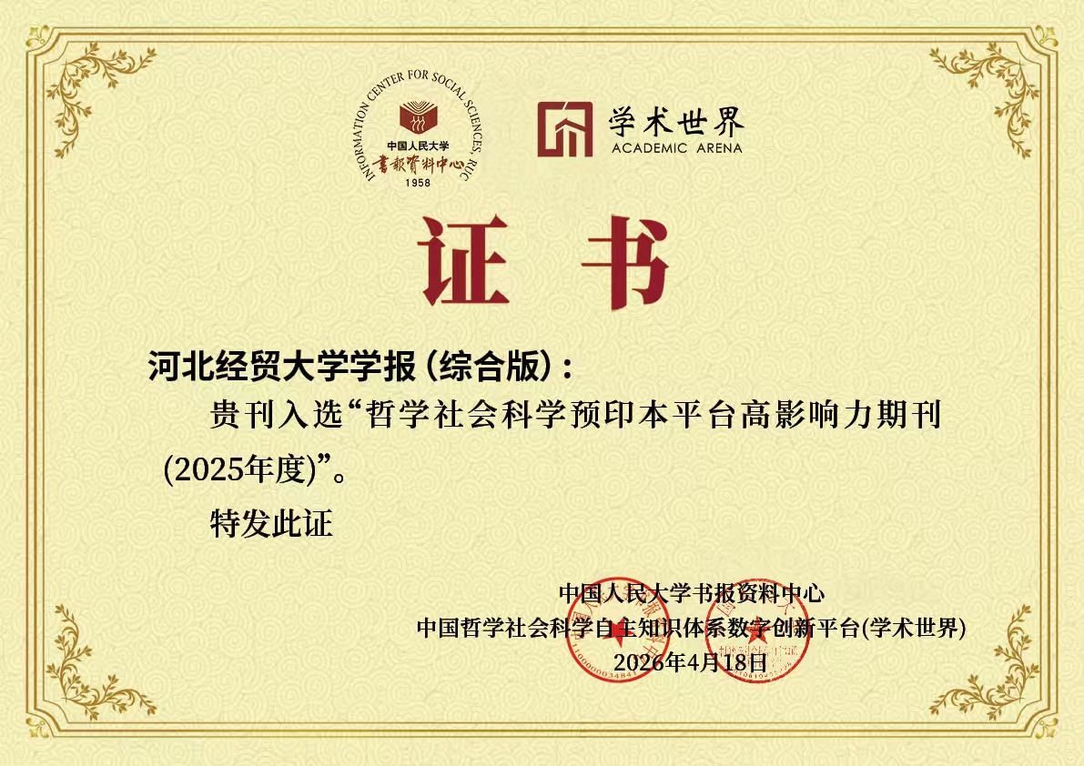 4月18日,在“2026年中国人民大学复印报刊资料转载指数发布暨‘人工智能+哲学社会科学研究’论坛”上,中国人民大学书报资料中心发布了《哲学社会科学预印本平台高影响力论文、期刊评价研究报告(2025年度)》。继去年首届入选后,《河北经贸大学学报(综合版)》再次入选“哲学社会科学预印本平台高影响力期刊”名单。