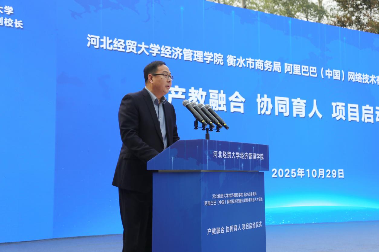 为进一步深化就业工作“校政企家”深度合作理念,构建数字贸易人才培养新模式,促进教育链、人才链、产业链与创新链的深度融合,10月29日,由经济管理学院同衡水市商务局、阿里国际站数字贸易人才基地联合主办的“产教融合、协同育人”项目正式启动。校党委常委、副校长耿辉建,衡水市商务局党组成员、副局长刘芸,河北省教育厅原一级调研员、学生就业创业事务中心原主任、河北省大学生就业创业协会理事长王士平,河北省大学生创业孵化园总经理韩宏信,阿里巴巴国际站校企合作负责人杨莉莉、阿里巴巴国际站(冀南)本地渠道商总经理王朝军,校就业指导服务中心主任池晶和学院领导出席启动仪式,30多家优秀企业家代表同学院师生一起见证了这一时刻。