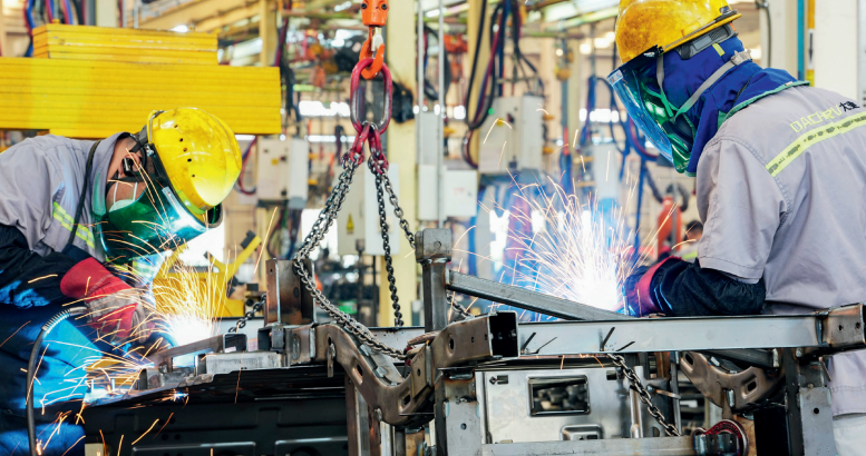 2025年5月25日,山东日照永利新能源车业现代化工厂内,工人在进行焊接和组装作业。图/中新社